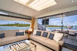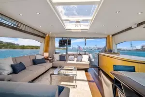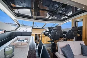 The salon is highlighted by a retractable carbon fiber roof and large hullside panoramic glass.
