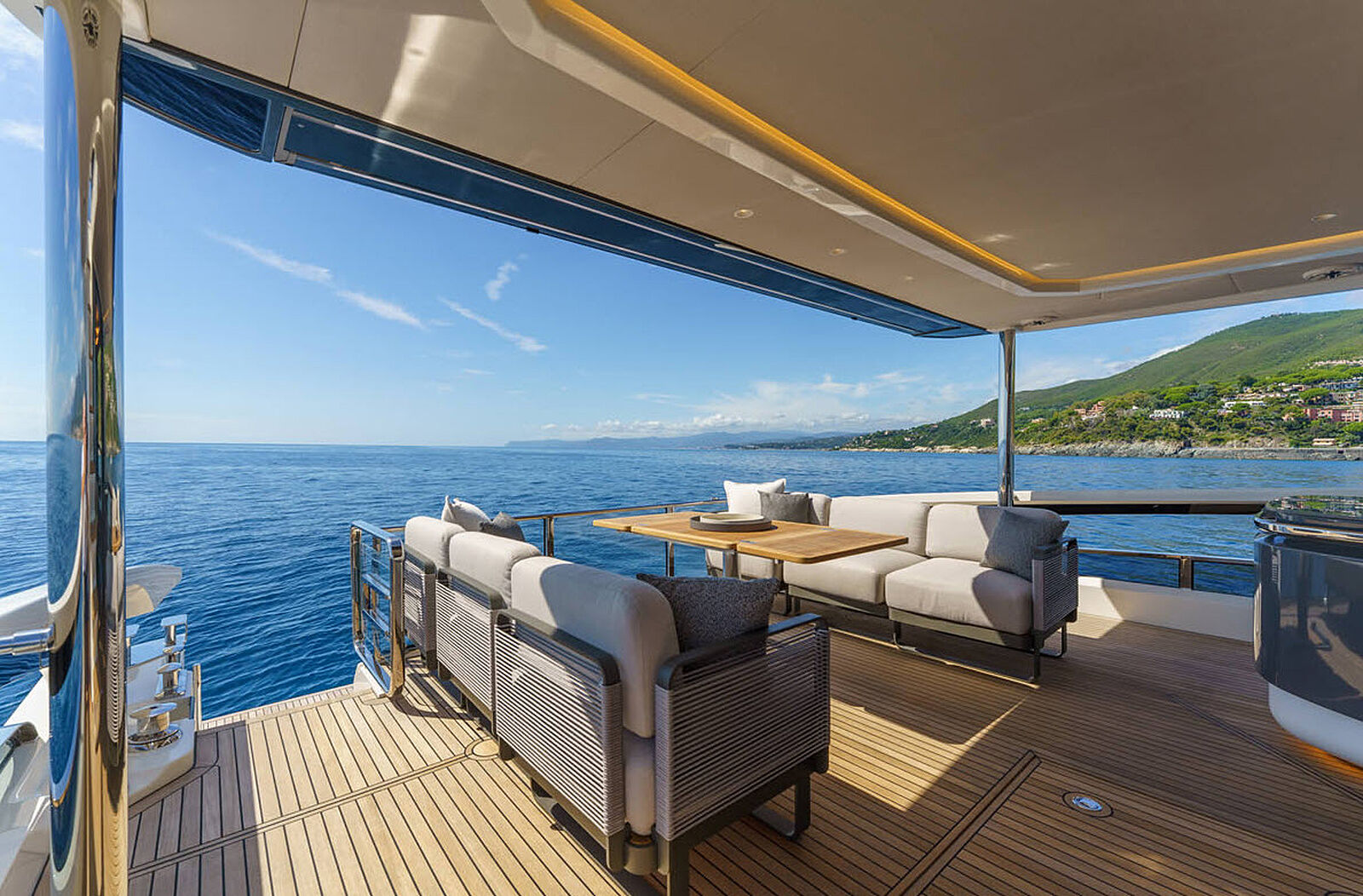Enjoy drinks and snacks out on the sun-kissed foredeck, where a U-shaped Portuguese Bridge-style sofa in plush upholstery is separated from a three-seater modular sunpad and love-seat by an extending timber table. The aft-deck, meanwhile, has to be one of the largest found on a vessel in this class, presenting enough room behind the glazed transom wall for a trio of sofas, a table and a wet-bar. To stern there’s a full-beam hydraulic swim platform as well as a sports locker for your water toys.