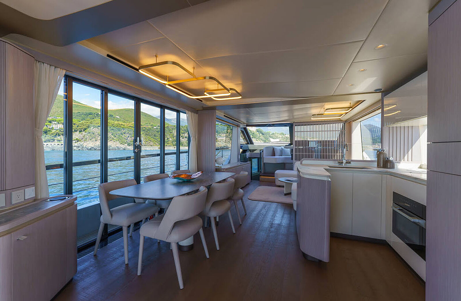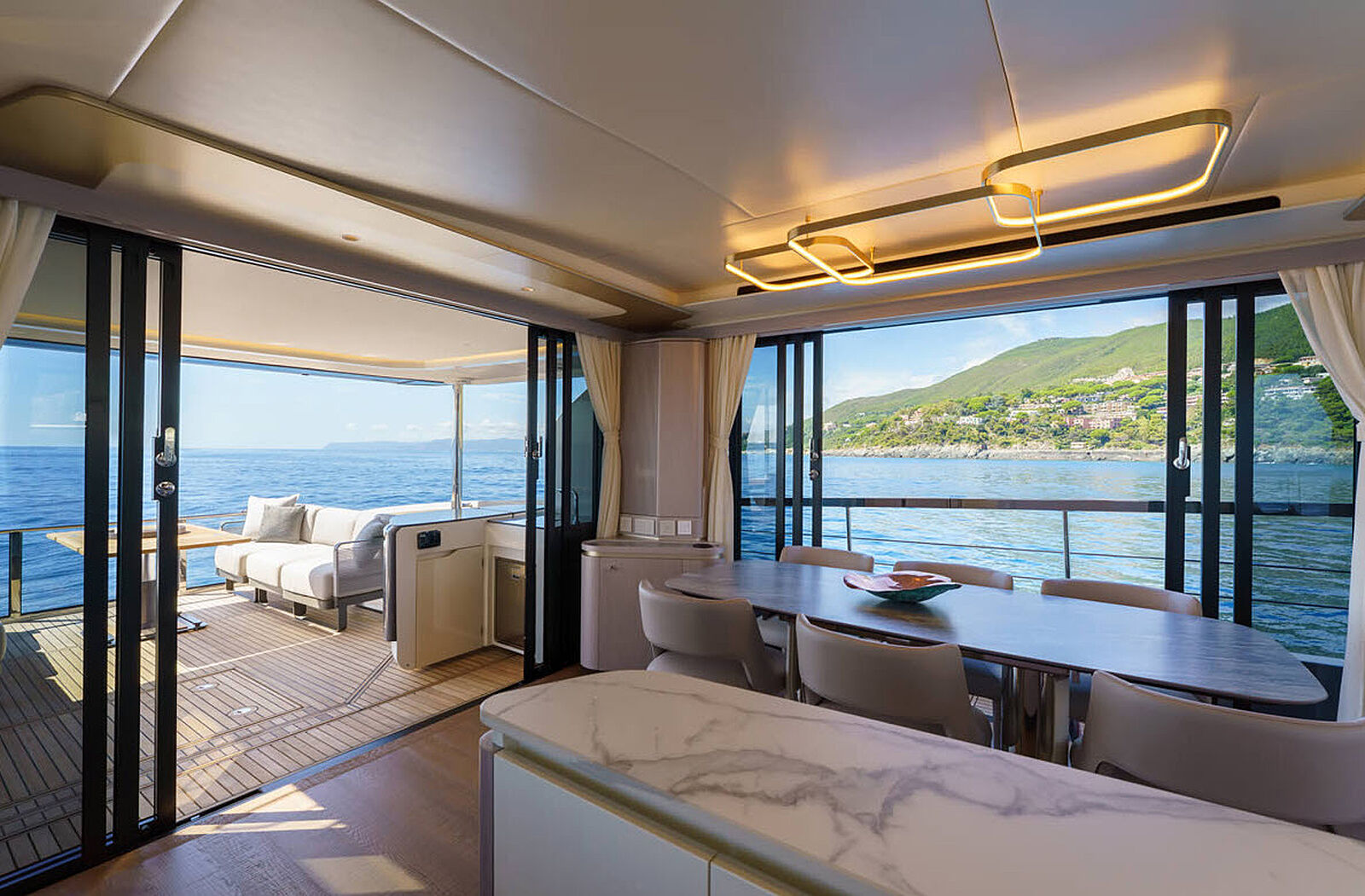 360-degree wrap-around glazing with bronze-accented pillars and a tinted finish, not to mention opening glass doors to port and aft, give free-flowing main-deck interiors plenty of light. Authentic wide-plank timber floors with a rich and inviting tone contrast with a muted and restrained use of color indoors, with elegant fluted wall panels, pale marble surfaces, cream upholstery and off-white lacquered surfaces delivering a vibe of muted elegance. Upon entry into the main-deck salon you will find a walk-in kitchen with a range of modern conveniences that sits across from a six-seater bespoke dining table, while further forward a low-slung u-shaped sofa and marble-topped coffee table sit across from a media console and storage unit. Up front there is a slightly elevated helm station to starboard with a pair of oversized Garmin MFD screens, cutting-edge navigational tech and a companion sofa.