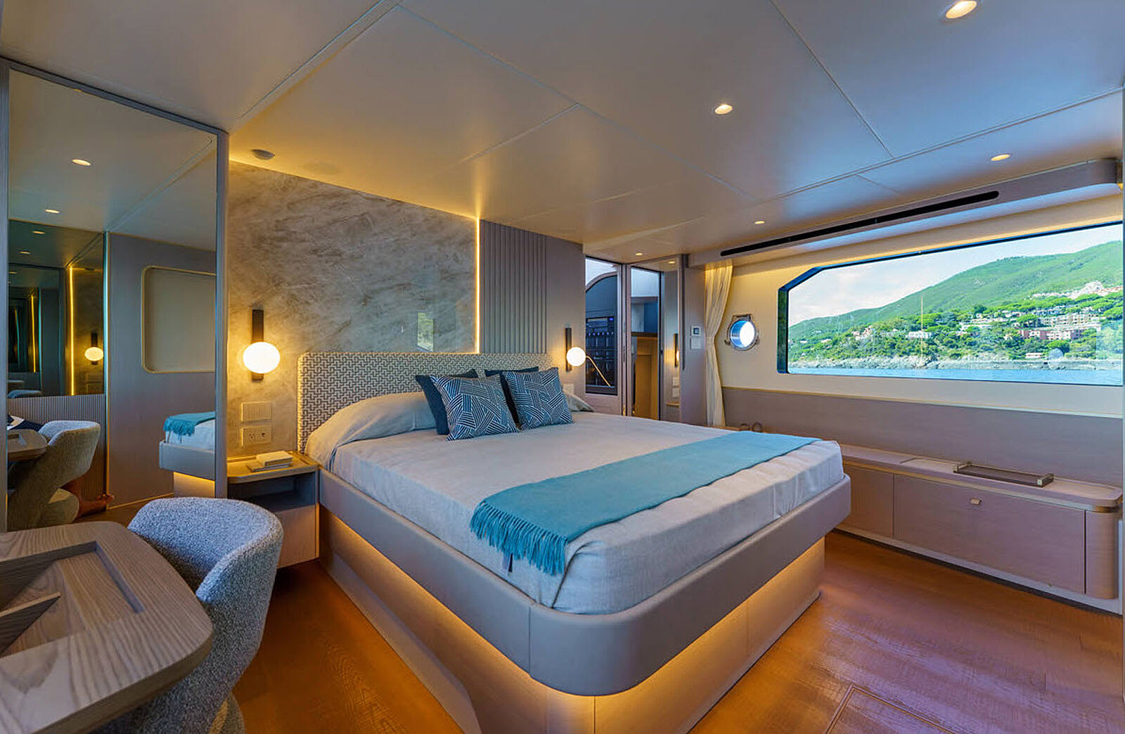 On the lower-deck there’s an aft crew quarters for two as well as an expansive four cabin and three head layout breezy enough to welcome eight guests for the night. A pair of twin cabins amidship share a Jack-and-Jill head with a shower, while a full-beam stateroom to the aft features a king-sized bed, a semi-open bathroom, a work desk, two panoramic window panes and full-height closets. The master stateroom, however, sits by the bow, and its full-beam dimensions house another king bed, a work desk and love-seat, a bespoke set of cabinets, two cinema-screen hull windows and a vast bathroom larger than many cabins with two sinks set in a marble vanity unit and a wet-room shower for two.